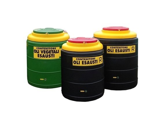 TANK OIL, konteineris naudotų augalinių aliejų laikymui, yra vertikalios, cilindro formos ir plokščiu dugnu.