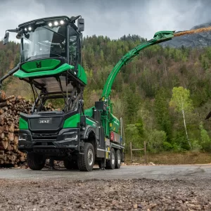 Profesionali savaeigė medienos kapoklė, varoma sunkvežimio varikliu, su komfortabilia ir novatoriška kabina